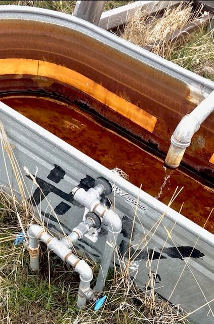 Windmill Diversion Tank & Scottish Highlanders: The windmill is back up & running now that the hard freezes are behind us but unfortunately the galvanized diversion tank (which catches water from windmill and splits it between ponds and the long cattle troughs) has become riddled with holes from the corrosive minerals in the well water. This same thing happened to our first batch of long (galvanized) cattle troughs, which we replaced with stainless steel. Luckily Lane Segerstrom says he won't be bringing the cows up until the grass is good (about a month from now) which gives me plenty of time to find and install a stainless steel catchment trough and re-plumb the water works.